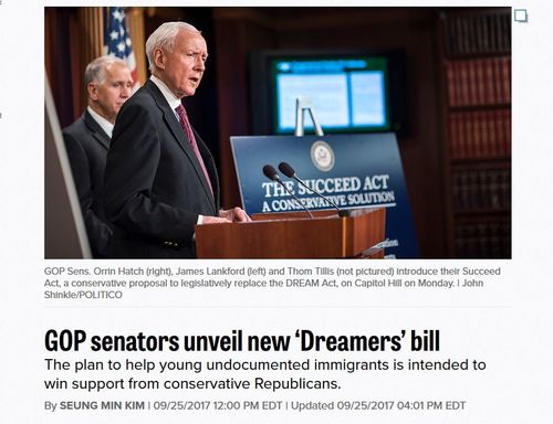A new Senate GOP proposal released Monday [September 25th] would create a pathway to legalization for so-called Dreamers, but it wouldn’t allow them to sponsor family members to the United States — one of several provisions that make the bill far more conservative than other relief measures for young undocumented immigrants. The chief writers of the bill — Republican Sens. Thom Tillis of North Carolina and James Lankford of Oklahoma — have touted their plan as a more GOP-friendly vision for the fate of young undocumented immigrants in the United States, especially compared to the DREAM Act, which was introduced by Sens. Dick Durbin (D-Ill.) and Lindsey Graham (R-S.C.).So they call it “a more GOP-friendly vision for the fate of young undocumented immigrants...”GOP senators unveil new ‘Dreamers’ bill , by Seung Min Kim, Politico, September 25, 2017