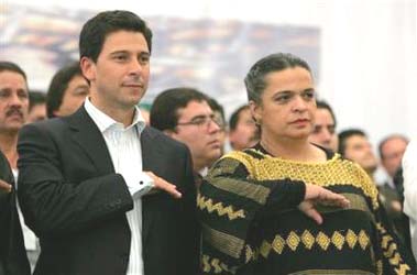 "California Assembly Speaker Fabian Nunez, left, salutes towards the flag while listening to the national anthem as he stands with Beatriz Paredes, who hopes to become the candidate for Mexico City Mayor under her party, the Institutional Revolutionary Party, or PRI, in Mexico City, Mexico on Friday Aug. 26, 2005."