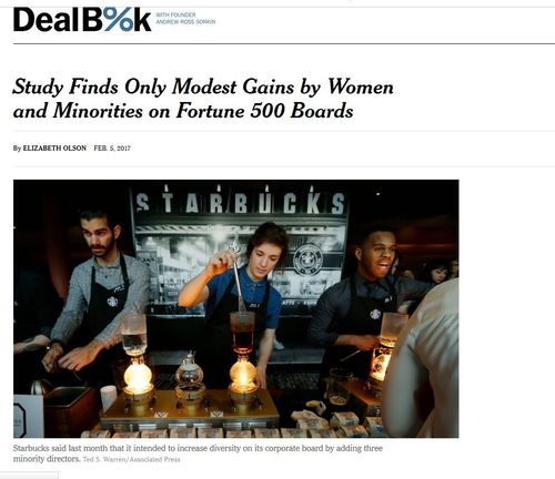 [Study Finds Only Modest Gains by Women and Minorities on Fortune 500 Boards, By Elizabeth Olson, NYT, February 5, 2017]