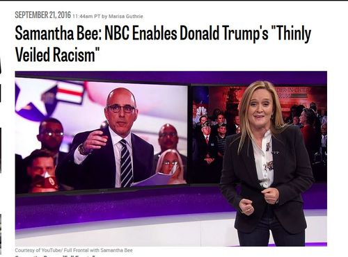 Samantha Bee — whose TBS program Full Frontal has in many ways taken up the mantle of political satire left by her old Daily Show boss Jon Stewart — delivered a stinging rebuke of NBC on her program Monday. The segment was a response to Jimmy Fallon’s friendly Tonight Show interview last Thursday with Donald Trump …Ooh, now that’s some expert professional comedy there.And she was name-checked in a New York Times editorial column by conservative writer Ross Douthat, who lamented that much of late-night comedy has been co-opted by the left.