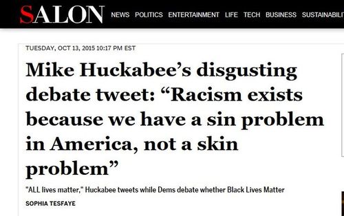 Mike Huckabee’s disgusting debate tweet: “Racism exists because we have a sin problem in America, not a skin problem”The moonbats are upset that Mike Huckabee tweeted a joke during last night's Democratic debate about Bernie Sanders that referred to Koreans and eating dogs."ALL lives matter," Huckabee tweets while Dems debate whether Black Lives Matter, by Sophia Tesfaye, Salon. October 13, 2015
