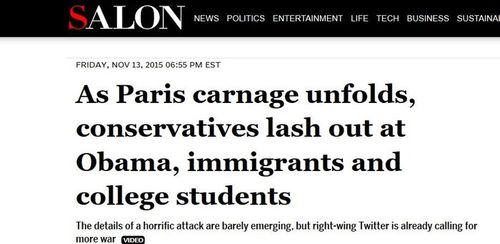 Can't load tweet https://twitter.com/NeelamKG/status/665298245166505986: Sorry, that page does not existThen there's Salon, of course: As Paris carnage unfolds, conservatives lash out at Obama, immigrants and college students