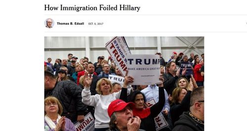 How Immigration Foiled Hillary Thomas B. Edsall OCT. 5, 2017In 2013, I drove cross-country and visited Holmes County, Ohio, which is about 45% Amish. The Amish, of course, have very high birthrates and thus are constantly out-migrating from Holmes County, looking for new farmland to buy. (Two days later I pulled up for the evening in rural Grand Junction, Colorado near the Utah border, and, sure enough, there was an Amish family.)Democrats point to a thousand reasons that Hillary Clinton lost the presidential election. Here is another.