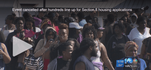 Event cancelled after hundreds line up for Section 8 housing applications, WAVY.com, May 27, 2016:We know that at some point soon, one of these affordable housing application events is going to break out into an uncontrollable example of spontaneous blackness, i.e. a riot.Hundreds of people lined up Thursday morning for affordable housing applications in Portsmouth.