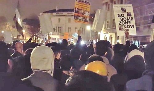 The street outside the empty embassy in Belgrave Square, London, was closed off as it filled with protestors and Islamic leaders chanting loudly and calling for America to be punished over Aleppo.The demonstration became an alternative to an official rally calling for an end to the bloodshed in Syria outside Downing Street.