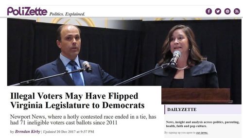 A forthcoming random draw to break a tie vote in a disputed state House of Delegates election in Virginia might not have been necessary had the state done a better job safeguarding its voter rolls, according to voter fraud experts. While no one has alleged fraud in the District 94 race between incumbent Republican David Yancey and Democratic challenger Shelly Simonds, Newport News — where the district is located — has seen ballots by ineligible voters in the past. Whoever wins in the end will determine whether Republicans maintain control of the Virginia legislature’s lower house, or Democrats gain a tie that will require the two parties to figure out some sort of power-sharing deal.So where do the illegal voters come in?Illegal Voters May Have Flipped Virginia Legislature to Democrats, by Brendan Kirby, Lifezette, December 20, 2017