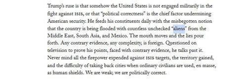 He feeds his constituents daily with the misbegotten notion that the country is being flooded with countless unchecked “aliens” from the Middle East, South Asia, and Mexico.Doesn’t Trump know that under U.S. law there are no such things as “aliens?” It’s in the Zeroth Amendment.
