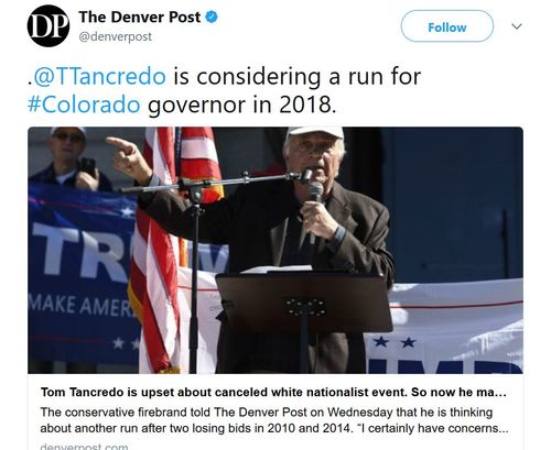 Tom Tancredo, upset about canceled white nationalist event, weighs another run for Colorado governorThere are several things wrong with this story, the main point being that in both Charlotte and Colorado Springs, the authorities decided they would not protect "white nationalists" from attackers. As Tom Tancredo wrote on Breitbart:A conservative activist is trying to draft Tancredo into the 2018 GOP contest