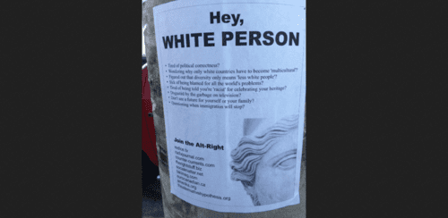 They begin “Hey, white person,” and invite readers to “join the alt-right.” The posters also list websites that promise to provide news from a “pro-European” perspective.