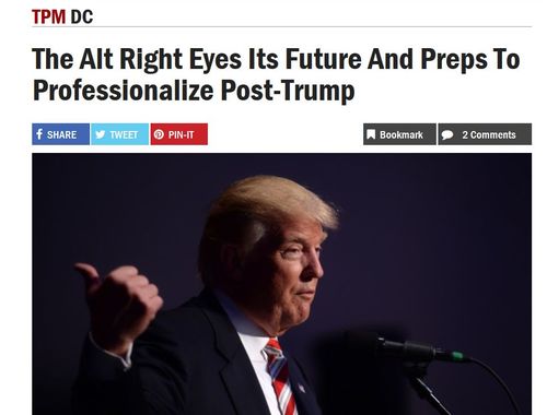 After years in relative obscurity in chatrooms and anonymous forums online, the disjointed alt right movement, closely aligned with the white nationalist movement, is experiencing a bit of a renaissance at the moment. In Europe, a backlash against a refugee crisis has resulted in Brexit. And in the United States, at the top of a major party ticket, the alt right finally has a Republican candidate in Donald Trump it can rally around.See National Press Club Director Bill McCarren, Who Cancelled Alt Right Press Conference, Deletes Anti-Alt Right, Pro-Clinton Tweet. By the way, if Bill McCarren [Email him] had genuine concerns about security, it may have stemmed from threats from "anti-racist activists." Such threats are common, and need to be investigated."It is in a way projecting on to him our hopes and dreams," said Spencer, a man who has said before he dreams of a white ethnostate. "We have not been made by Trump, but we want to make Trump and we want to imagine him in our image."