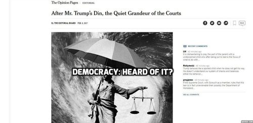 The last item on that list reminds me of Times's February 8 editorial After Mr. Trump’s Din, the Quiet Grandeur of the Courts. The New York Times simply does not believe in democracy. Trump was elected partly to block Muslim immigration, which is certainly within the powers of the Presidency (Obama did it briefly in 2011, but didn't get this kind of reaction because people knew he didn't mean it.) The Times thinks that unelected judges—who are New York Times readers—have a right to stop this.