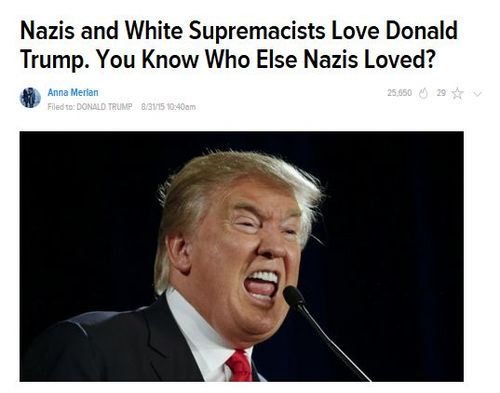 [T]he virulently anti-immigrant VDare is also on board, praising Trump as an“immigration patriot” and claiming in July that a “political and economic terror campaign” is being waged against him, one that somehow hasn’t prevented him from polling well and participating in national debates.Remember, "immigration patriot" goes in scare quotes, but in Gawkerland concepts like "bodyshaming" and "pansexual" must be taken very seriously.[Nazis and White Supremacists Love Donald Trump. You Know Who Else Nazis Loved? August 31, 2015]