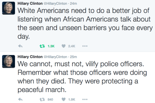 Remember that even after a Black Lives Matter gunman committed mass murder in Dallas, Hillary was still attacking cops on Twitter on their behalf. As Steve Sailer put it, "Hillary’s initial response to the BLM terrorist massacre of Dallas cops was to lecture whites on “implicit bias.”