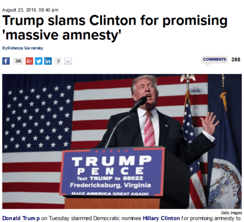 Trump slams Clinton for promising 'massive amnesty'For the record, the US already has a Deportation Force—ICE, Immigration And Customs Enforcement. And in the event of a major crackdown, it has all the other Federal Agencies, and the US Army. I've mentioned that in 2006, I had the opportunity to speak to former Border Patrolman Bob Park, who as a young man took part in Operation Wetback, in 1954. He pointed out that Eisenhower didn't have to pass any laws.By Rebecca Savransky, The Hill, August 23, 2016