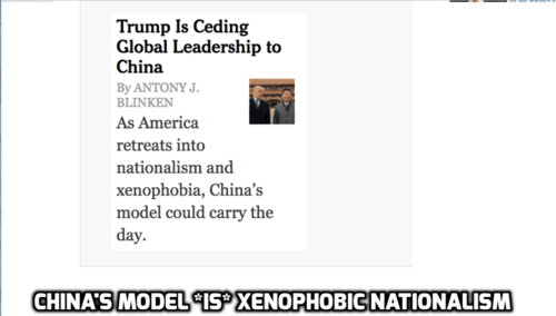 In contrast to Trump’s nationalism and xenophobia, we should emulate China’s model (xenophobia and nationalism).