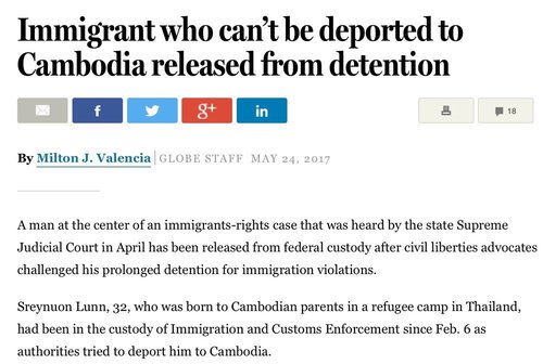[Immigrant Who Can’t Be Deported To Cambodia Released From Detention, by Milton Valencia, Boston Globe, May 24, 2017]