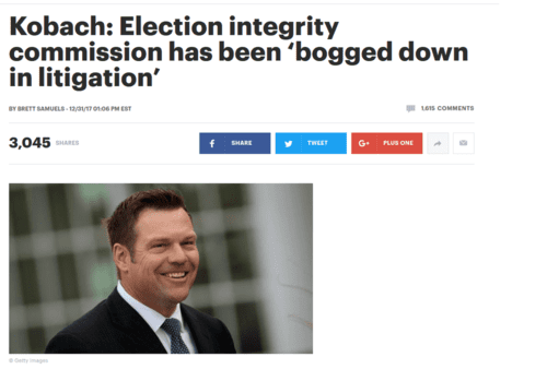 Kansas Secretary of State Kris Kobach said in a new interview that President Trump's election integrity panel has been unable to meet for months due to several lawsuits against the panel. “Much of the past few months has been spent by commission staff answering discovery requests for information and drafting affidavits and things that like – going through the legwork of litigation, and that takes time,” Kobach said, the Topeka Capital-Journal reported Saturday [December 30th]. “I’m not aware of any presidential commission that has encountered so much litigation from special interest groups,” he added.These “special interest groups” have a special interest in us not having secure voter ID. Why could that be?Kobach: Election integrity commission has been ‘bogged down in litigation’