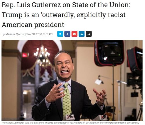Trump’s speech also revealed one crucial fact: right-wingers do not have a monopoly on “hate.” “Hate” was on full display in the reaction of Democratic leaders, who might as well have donned the black masks of their Antifa allies. The expression on Luis Gutierrez’s face, before he threw a tantrum and stormed out of the chamber, was that of a raving lunatic in need of a straitjacket. “Hate” oozed through his greasy pores. After exiting, Gutierrez proclaimed: “I was hoping to get through my life without having to witness an outwardly, explicitly racist American President…. My luck ran out.” [Rep. Luis Gutierrez walks out of Trump's State of the Union as progressives write off bipartisanship permanently, by Philip Wegmann, Washington Examiner, January 30, 2018 ]