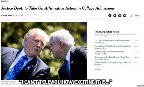 Justice Dept. to Take On Affirmative Action in College AdmissionsProbably leaked by a black lawyer on the permanent staff. Civil Rights bureaucrats are almost all far-Left Democrats. They’re also majority black.By Charlie Savage, August 1, 2017