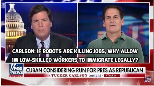 MARK CUBAN: We need to find ways to reduce the cost of those entitlements while maintaining the same level of care. I’m a tech guy, and the reality is I would focus on creating technology solutions. I have investments that I see myself where it can have an impact. I think there’s a way that we can reduce the size of government, the size of bureaucracy that deals with healthcare but it’s going to take somebody who understands technology that can introduce technology to find those solutions, and I think it can happen relatively quickly.TUCKER CARLSON: You definitely understand technology and you’ve been one of the people, to your great credit, who’s been sounding the alarm about automation’s effect on employment: you said robots are basically going to kill a lot of jobs; I think you’re right. Given that, is allowing about a million low-wage low-skilled workers into the country every year legally is that a good idea? Is that the right level of immigration?
