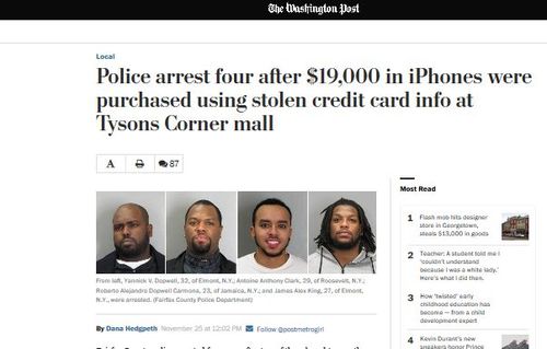 Police arrest four after $19,000 in iPhones were purchased using stolen credit card info at Tysons Corner mallHere is the lead paragraph:
