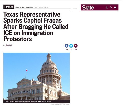 A near-brawl broke out on the floor of the Texas House of Representatives Monday after a Republican legislator declared he had called Immigration and Customs Enforcement on protestors decrying the state’s new anti-sanctuary city bill, according to two Democratic congressmen. Democratic representatives Ramon Romero Jr. and Cesar Blanco told reporters that they were discussing the demonstration, which sent hundreds into the gallery chanting in protest of Texas SB 4, which threatens local law enforcement agents with jail if they do not cooperate with federal immigration authorities. They were interrupted, Romero and Blanco said, by GOP representative Matt Rinaldi, who called the protestors a “disgrace” and said, “Fuck them, I called ICE.” In the resulting fracas, Rinaldi said he was pushed and shoved, calling the other representatives’ behavior “basically just bullying.” Another rep, Justin Rodriguez, told the Texas Tribune he heard Rinaldi threaten to “put a bullet in one of my colleagues’ heads.” For his part, Rinaldi told the Tribune that some of the protestors held signs reading “I’m illegal and I’m here to stay,” and that he called ICE “to incentivize them to leave the House.”We've been asking for years why they don't arrest illegals who demonstrate like this, and deport them as well. See my article So Why Doesn’t The “Broken Windows” Theory Apply To Illegal Aliens?, November 19, 2011. I assume that Texas state representatives Ramon Romero Jr. and Cesar Blanco can't be deported, but perhaps the leadership of the Texas legislature can do something about them, as can the Texas Department of Public Safety—Rinaldi's statement of what happened is below: Can't load tweet https://twitter.com/MattRinaldiTX/status/869269896365998080: Unknown MIME type: text/html