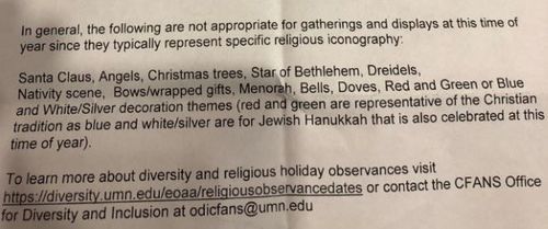 *UPDATE: A University of Minnesota representative said the document in question was distributed “as a conversation piece to facilitate dialogue.” The representative said it does not represent the official position of the school or the Office of Equal Opportunity and Affirmative Action and was not shared campus-wide.Above, it suggests that you check out the Religious Observance Dates page at the UM Office for Equity and Diversity | Equal Opportunity and Affirmative Action department.