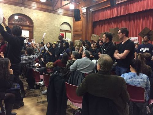 “We believe that his views are racist. Our goal is not to give him a platform on this campus,” student Emma Ronai-Durning said before disappearing down a stairwell.