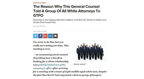 I’m sorry to do this, but you really are wasting our time. This meeting is over.— an unnamed general counsel describing how a law firm looking for a client relationship was politely kicked out of the company’s office after arriving for a meeting with a team of eight middle-aged white men, despite the fact that the GC had requested a diverse group of lawyers.