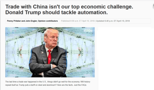 Trade with China isn’t our top economic challenge. Donald Trump should tackle automation. by Penny Pritzker and John Engler, USA Today, April 10, 2018Trump’s tariffs miss the mark. Our central economic challenge is automation, not trade. It’s changing millions of jobs, and we need people who are trained to do them.
