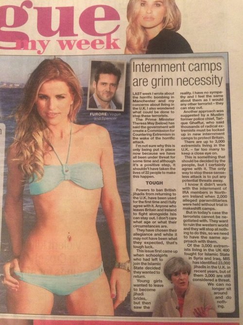 On the other hand, I'm linking to one of many MSM denunciations because, ominously, I can't find the original on the Sunday World website: Defiant Vogue Williams sports floaty florals during London night out... as she emerges after being branded 'cruel and stupid' over call for internment of Muslim terror suspects, by Ciara Farmer and Becky Freeth, Daily Mail, June 9, 2017.