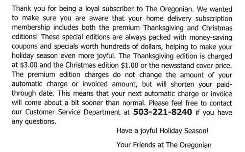 The War On Christmas begins with this early entry from The Oregonian. A note to subscribers touts the special Thanksgiving and Christmas editions of the leftist newspaper, but it closes with this: "Have a joyful Holiday Season!"