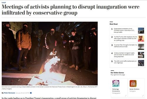 Meetings of activists planning to disrupt inauguration were infiltrated by conservative groupIn other words, the cops were so incompetent they couldn't stop a terror attack on conservatives without the help of a conservative group, which had to infiltrate the terrorist group.By Peter Hermann, Washington Post, January 25 at 2:19 PM