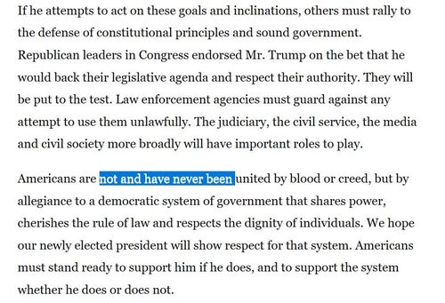 Closing its editorial about Donald Trump's victory, the Washington Post Editorial Board wrote thusly of what unites Americans: "Americans are not and have never been united by blood or creed, but by allegiance to a democratic system of government that shares power, cherishes the rule of law and respects the dignity of individuals."