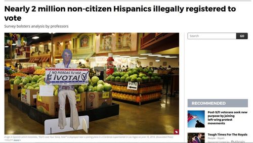 A large number of non-citizen Hispanics, as many as 2 million, were illegally registered to vote in the U.S., according to a nationwide poll. The National Hispanic Survey provides additional evidence for use by anti-voter fraud conservatives and bolsters an analysis by professors at Old Dominion University who say non-citizens registered and voted in potentially large numbers.Nearly 2 million non-citizen Hispanics illegally registered to vote, by Rowan Scarborough, Washington Times, Feb. 15, 2017