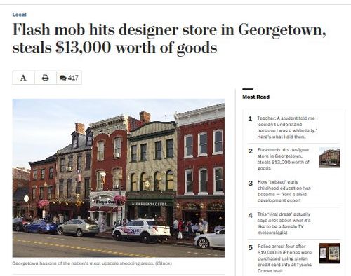 Here is the story's lead and second and third sentences:A flash mob hit a designer store in Georgetown Tuesday evening and stole $13,000 worth of items, according to D.C. Police.The Post doesn't tell readers what the suspects look like (not that it has to), but does note that the "incident comes after a group of merchants in Georgetown ended its use of a private messaging service that many retailers, residents and police officers had used to talk about people they thought were suspicious. There were concerns that the service was being used to racially profile people."The incident happened just before 6 p.m. at the Diesel store in the 3000 block of M Street NW. A large group of young people went into the store and grabbed several items off the racks, according to a police report.