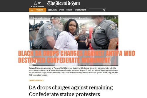 In that case anarchy was allowed to reign: see Anarcho-Tyranny Update: Black DA Drops All Charges Against Black Woman, Others, Who Destroyed Confederate Statue After Charlottesville.In this current paroxysm of Establishment-driven hate and fear, how long until a mob of good-thinkers lynches somebody?