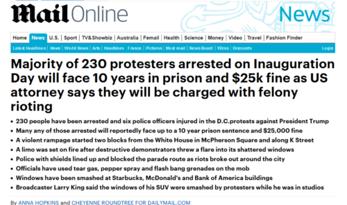 Anti-Trump protesters will face up to 10 years in prison | Daily Mail OnlineBelow, two views of what I think was the same limo which was protested by someone who threw a protest flare into its interior.Majority of 230 protesters arrested on Inauguration Day will face 10 years in prison and $25k fine as US attorney says they will be charged with felony rioting