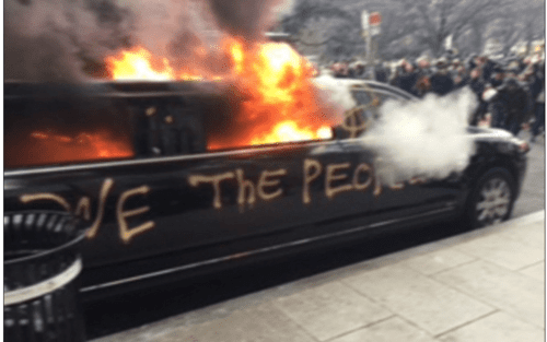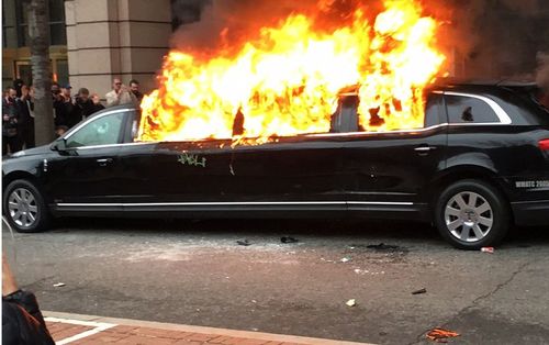 - A limo was set on fire after destructive demonstrators threw a flare into its shattered windows