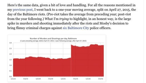 But Chicago is murky compared to Baltimore, where the current high rate of homicides can be dated to April 27, 2015, the day of the BLM riot over Freddie Gray’s death. This may be the single most clear-cut case in the history of social science.