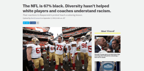 The NFL is 67% black. Diversity hasn’t helped white players and coaches understand racism.[Comment at Unz.com]Their reactions to Kaepernick’s protest teach a sobering lesson.