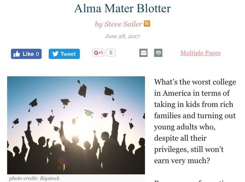 What’s the worst college in America in terms of taking in kids from rich families and turning out young adults who, despite all their privileges, still won’t earn very much?Read the whole thing there.By one way of counting, the biggest loser is Middlebury College in the Vermont ski country, site of the recent Charles Murray riot. The median parents of Middlebury students earned $219,600 per year (in 2015 dollars). Moreover, Middlebury has the highest mean income parents at $559,000 per year, which is nice.