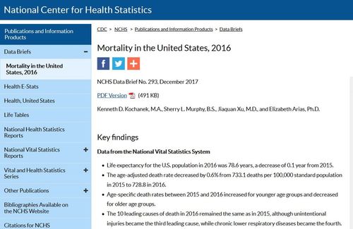 Life expectancy in the United States dropped again in 2016, the first time in over a half century that life expectancy declined two straight years. Death rates were up in people under 65, while down among oldsters.