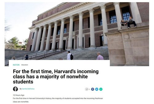 Harvard’s college admission and financial aid website posted statistics about the incoming freshman Class of 2021 this week. 50.8 percent are from minority groups, including African Americans, Hispanics, Asian Americans, Native Americans, and Native Hawaiians. That’s up from 47.3 percent last year.