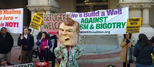 Activists from the organizing group ANSWER Coalition stood with members of Code Pink and other protesters, waving signs and calling Trump racist while speakers repeated that they were “building a wall against racism and bigotry."Who is the ANSWER Coalition? From beyond the grave, Christopher Hitchens tells us:[Activists Descend On Trump Hotel To Protest 'Racism And Bigotry' [Photos], by Steve Birr, October 26, 2016]