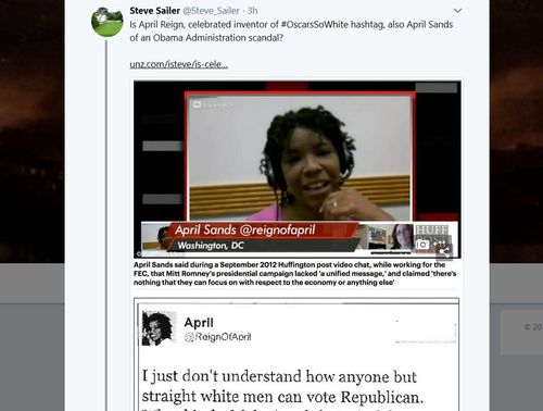 Is April Reign, celebrated inventor of #OscarsSoWhite hashtag, also April Sands of an Obama Administration scandal?https://t.co/0Y6mCqiRUN pic.twitter.com/xSQyZsCIOT