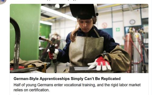 German-Style Apprenticeships Simply Can’t Be ReplicatedIn other words, people whose main strength is a strong back do worse after age 50 in Germany than people whose main strength is a strong brain. But in America …Half of young Germans enter vocational training, and the rigid labor market relies on certification.