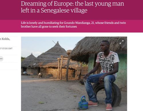 Dreaming of Europe: the last young man left in a Senegalese villageThe article isn’t particularly illuminating, but it also doesn’t yank your chain too badly to try to get you to believe that all these young men are leaving Senegal because there is some sort of temporary crisis going on there from which the young men (but not the women or children or elderly) need refuge.Life is lonely and humiliating for Goundo Wandianga, 21, whose friends and twin brother have all gone to seek their fortunes