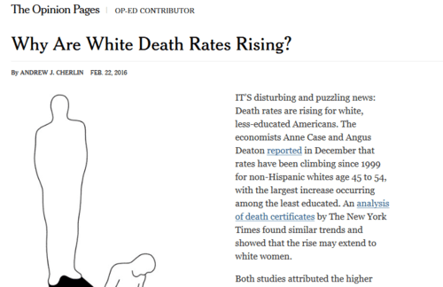 Perhaps, although the death rate among youngish blacks was sky-high around 1990, due to shooting each other over crack and dying of AIDS, which is hard to fit in with Cherlin’s economic generational theory. I’m not saying Cherlin’s wrong, just that specific causes of people dropping dead rather than theories of a general malaise also need to be looked at.By ANDREW J. CHERLIN FEB. 22, 2016 315 COMMENTS