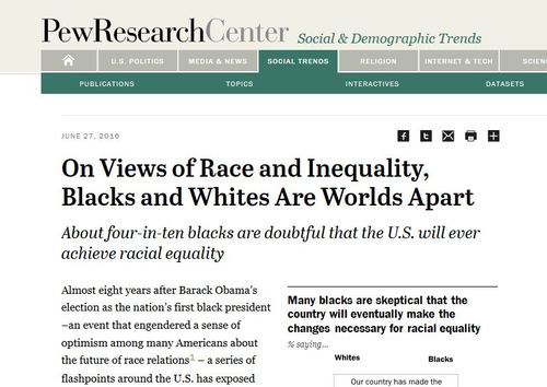 The Pew Research Center conducted a survey, mostly in March and April this year, about Americans' attitudes to race relations. Results have just been published. The sample size wasn't impressive: 1,800 white respondents, 1,000 blacks, and a few hundred Hispanics; but the results agree with my own unsystematic observations.